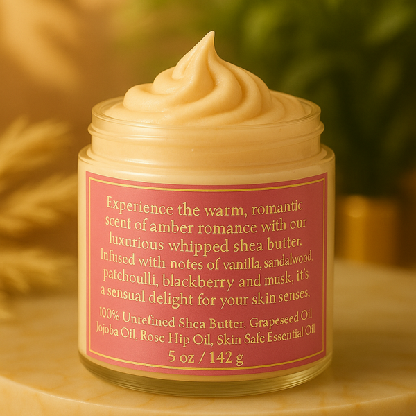 Indulge in the warm, inviting scent of Amber Romance, a fragrance that balances sweetness, depth, and sophistication. This whipped shea butter envelops your skin in a luxurious, soothing blend of pear, rose, and amber, creating a scent that is both romantic and sensual.